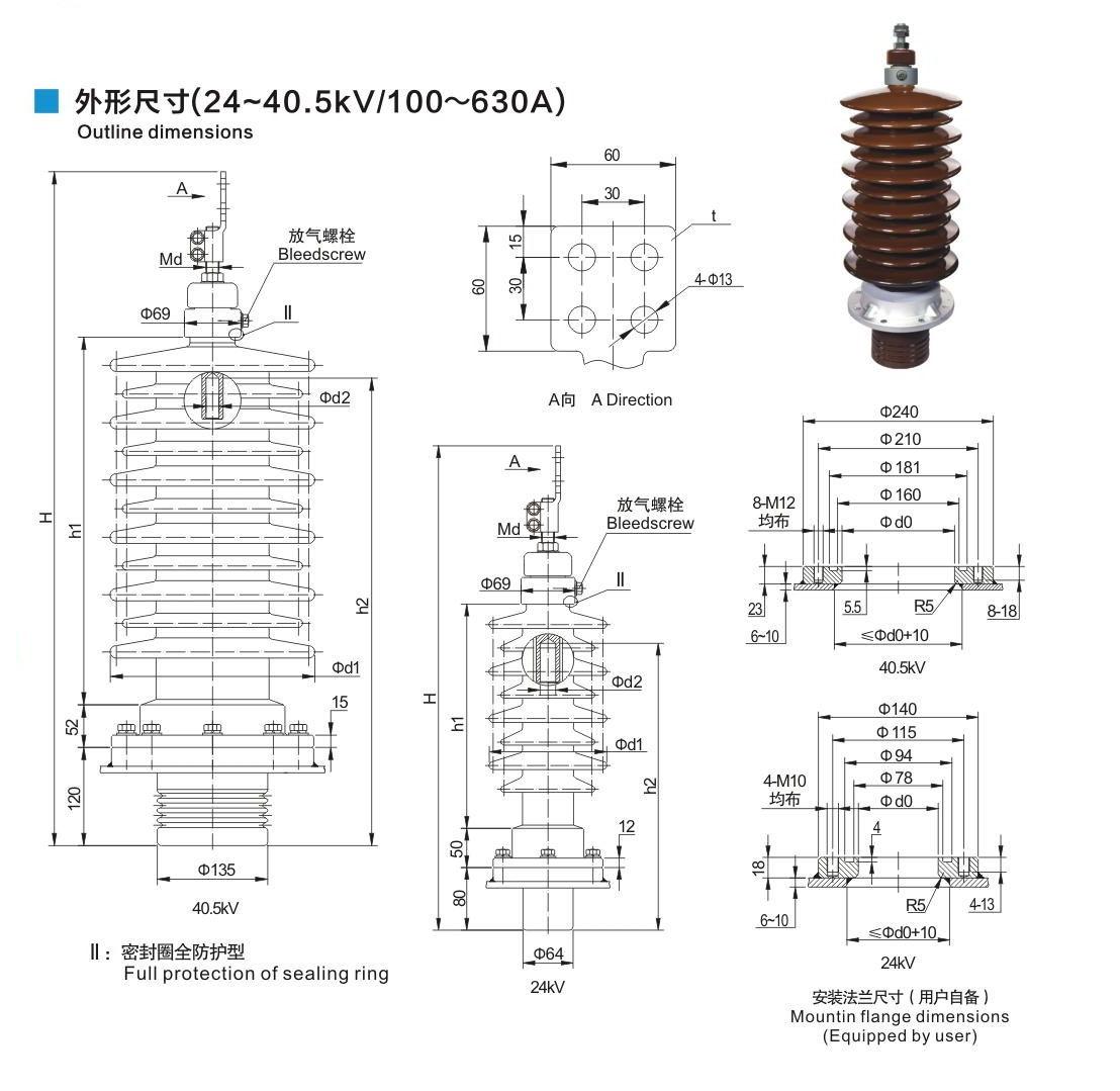 鋁法蘭瓷套管24~40.5kV/100~630A穿纜式套管